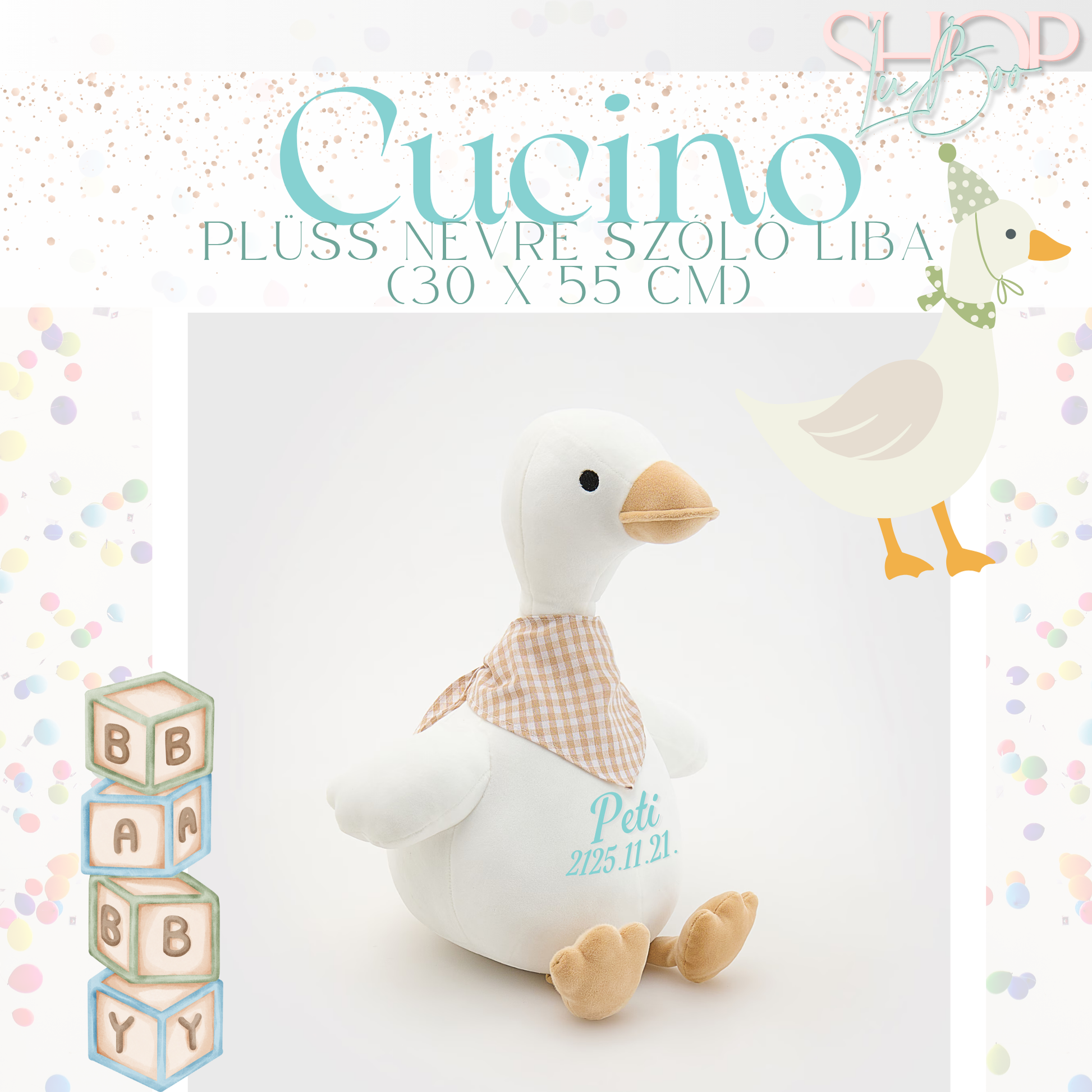 Ajándékozz olyan egyedi babaajándékot, ami valóban szívhez szóló: egy névre szóló plüss libát, ami örökre elkíséri a kisbabát!