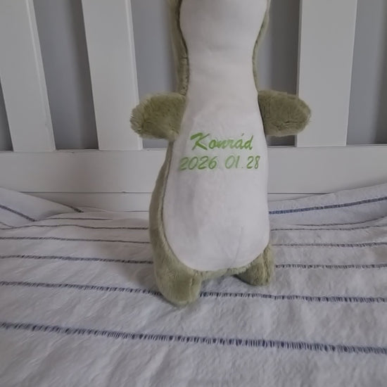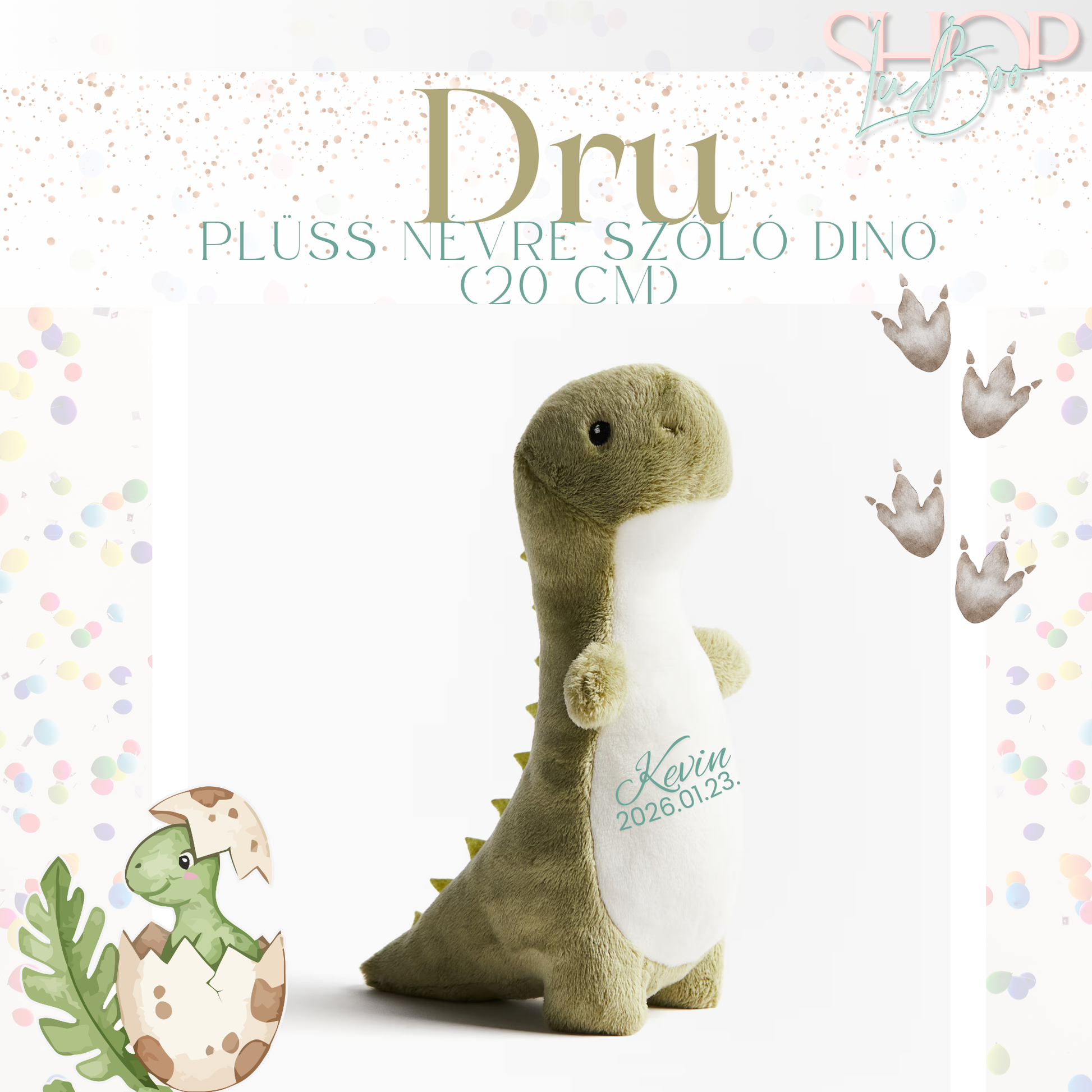 A Dru egy aranyos, személyre szabott plüss dinoszaurusz, amely a baba nevével és születési dátumával igazán különlegessé válik. Ez a 20 cm-es puha plüss nem csak egy játék, hanem egy egyedi emlékőr, amit a gyermek éveken át megőrizhet.