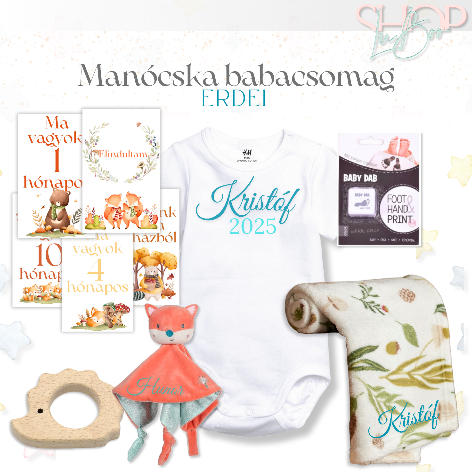 A csomag aranyos, természet ihlette elemekkel – erdei állatkás motívumokkal, földszínekkel és puha anyagokkal – varázsol meghitt pillanatokat az első napoktól kezdve. A személyre szabható, névre szóló kiegészítők pedig gondoskodnak arról, hogy minden részlet valóban egyedi és emlékezetes legyen.