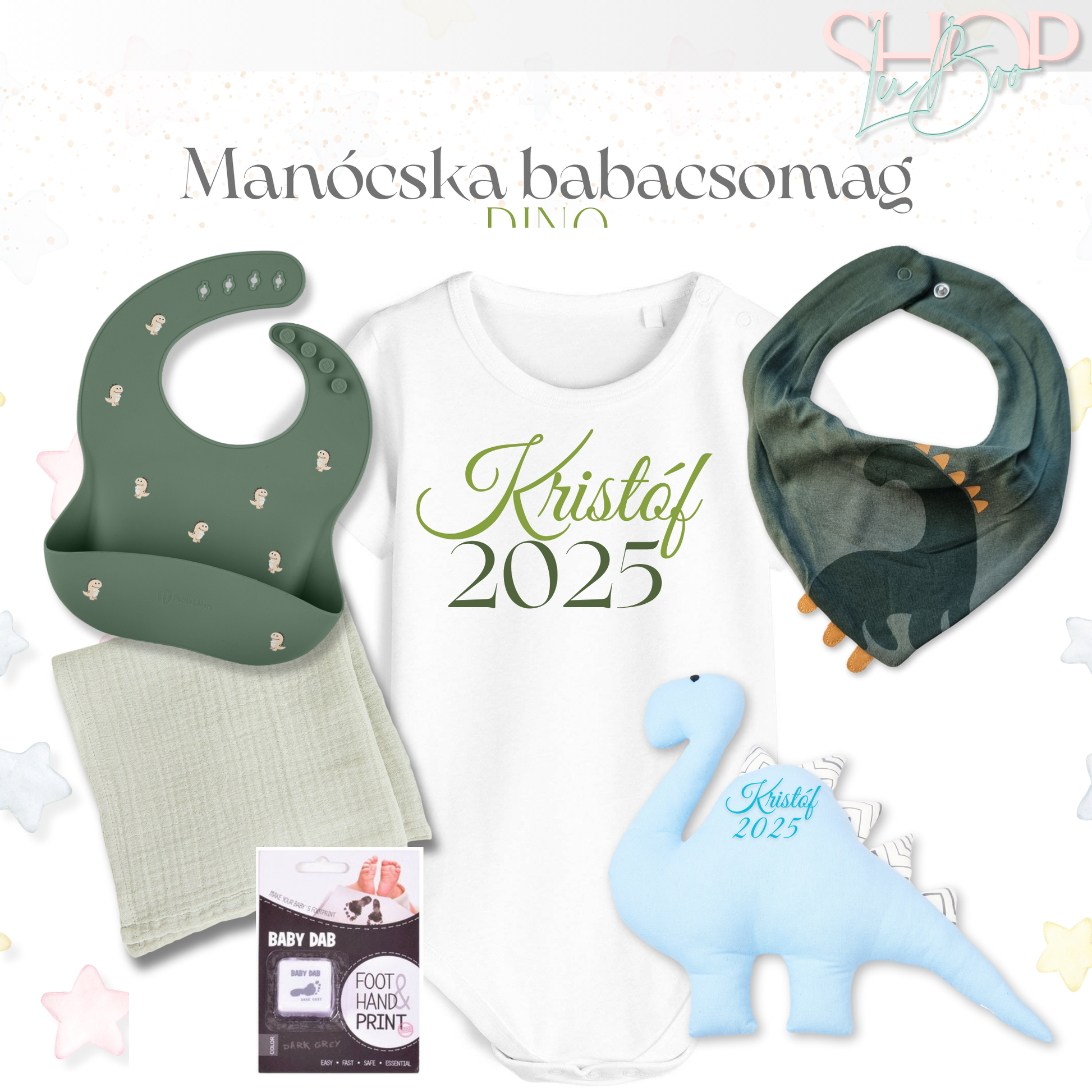 Ha igazán különleges ajándékot keresel kisbabának és szüleinek, a Manócska Dinós Babalátogató Csomag tökéletes választás. A vidám dínómintás kiegészítők nemcsak aranyosak és játékosak, hanem egyedivé is tehetők a baba nevével – így az ajándék valóban szívhez szóló és maradandó élmény lesz.