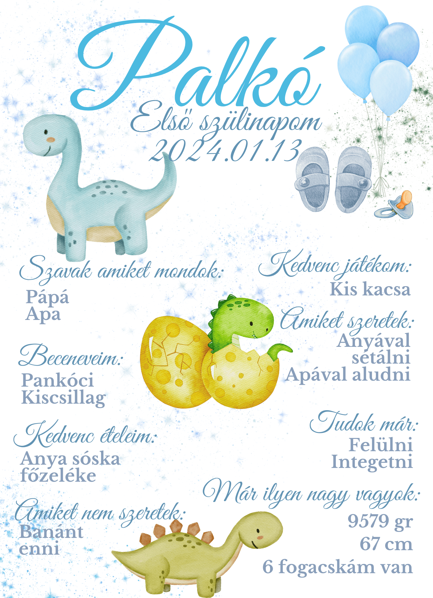 Lepd meg a kis ünnepeltet egy különleges ajándékkal: ez a dinoszaurusz mintás, egyedi tervezésű emlékplakát tökéletesen megörökíti a baba első évének legfontosabb pillanatait. A kedvenc játékok, első szavak, becenevek és az aktuális méretek mind-mind személyre szabva kerülnek a plakátra, így egy igazán megható és időtálló emlék születik.