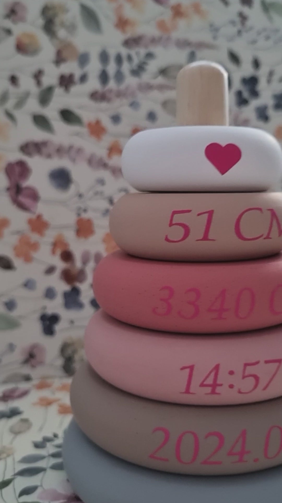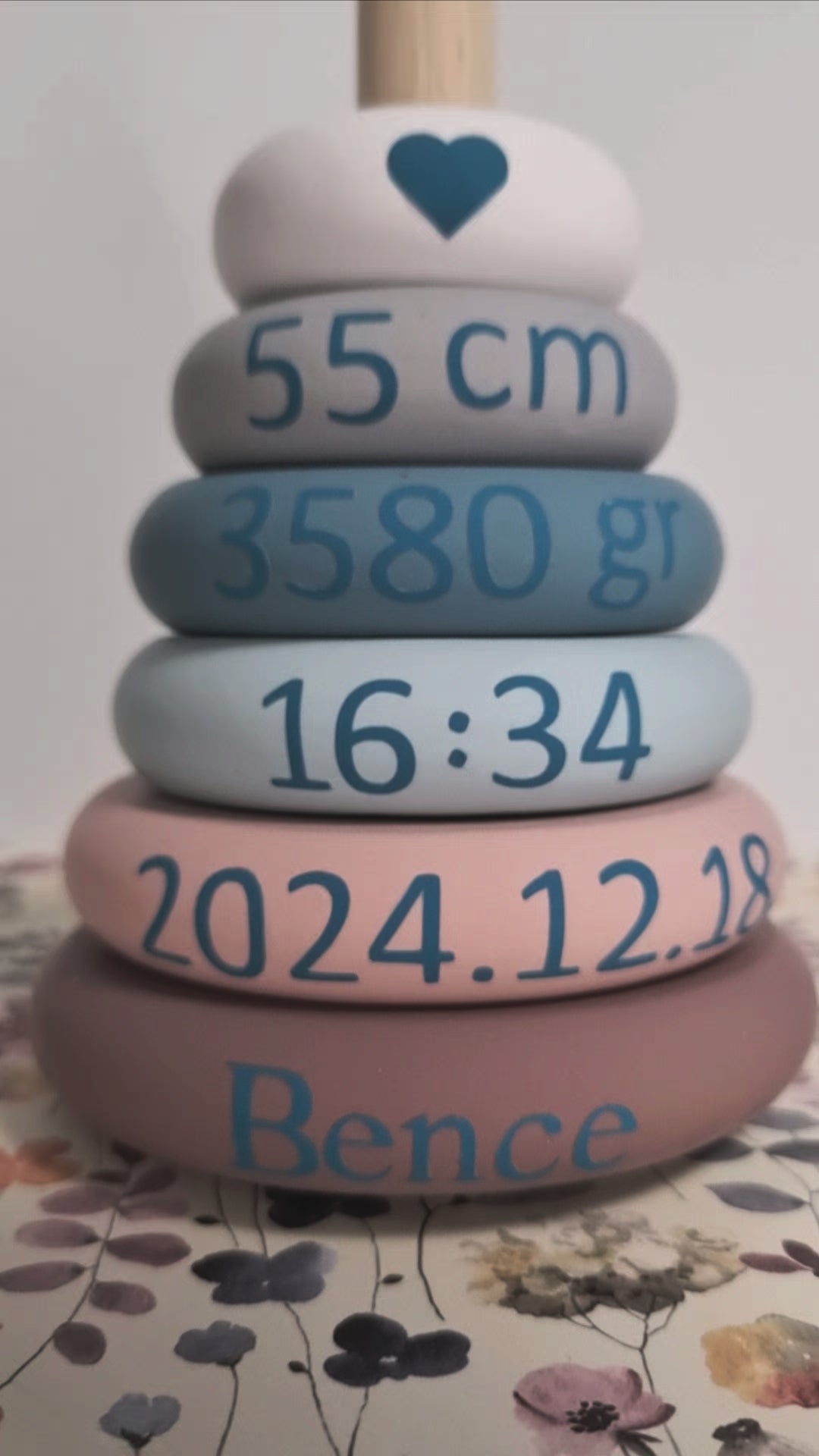 A baba nevével és születési adataival (születési dátum, súly, hossz, időpont) díszített gyűrűk nemcsak esztétikusak, hanem fejlesztik a kézügyességet és a koordinációt is.